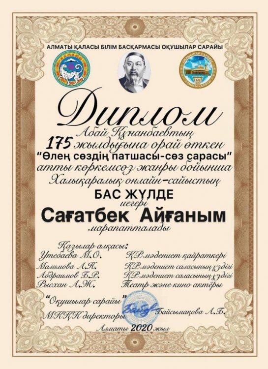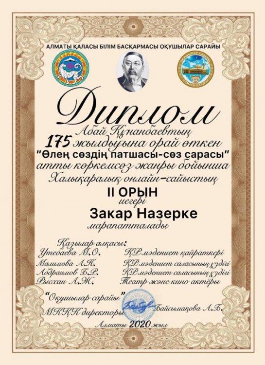 Алматы қаласы Білім басқармасының бастауымен өткізілген Абай Құнанбаевтың 175 жылдығына орай "Өлең сөздің патшасы - сөз сарасы" атты көркемсөз жанры бойынша Халықаралық онлайн - сайстың жүлдегерлері: