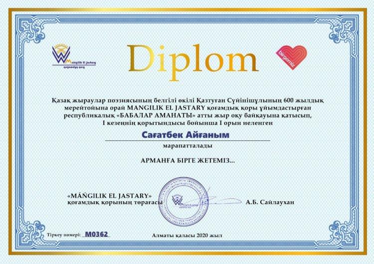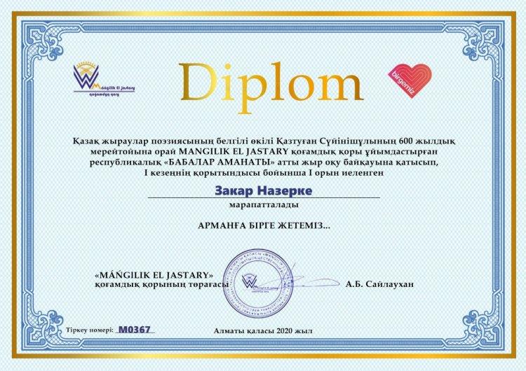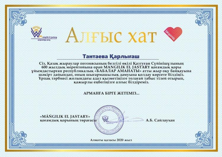 Қазақ жыраулар поэзиясының белгілі өкілі Қазтуған Сүйінішұлының 600 жылдық мерейтойына орай MANGILIK EL JASTARY қоғамдық қоры ұйымдастырылған республикалық "БАБАЛАР АМАНАТЫ" атты жыр оқуына қатысып орын алған шәкірттеріміз бен оларды дайындаған ұстаздарымыздың