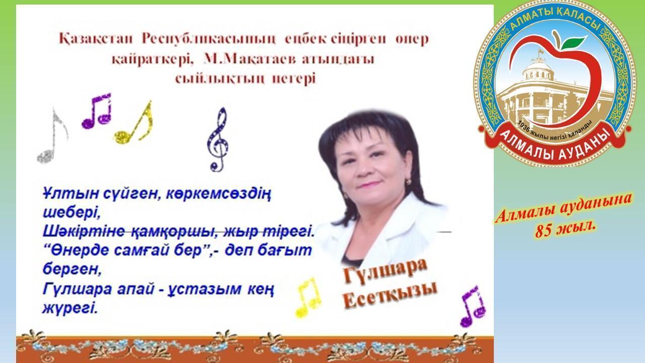 Қазақстан Республикасының еңбек сіңірген өнер қайраткері, М.Мақатаев сыйлығының иегері ,Білім беру ісінің үздігі Есетова Гүлшара Есетқызы Алмалы ауданында танымал тұлға. Алмалы ауданының ардагерлер кеңесінің белсенді мүшесі. Жас ұрпаққа патриоттық тәрбие беруде әртүрлі шаралар өткізуге атсалысуда.