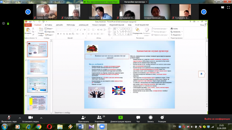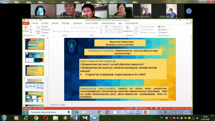 Алматы қаласындағы Педагогикалық шеберлік орталығы (ПШО) Б.Атыханұлы атындағы №36 гимназияның мұғалімдерімен "Қашықтықтан оқытуды ұйымдастыру ерекшеліктері" тақырыбында вебинар жүргізді. Педагогикалық шеберлік орталығының тренері Толықбаева Ғалия Нұрманқызы бастаған вебинарда "Қашықтықтан оқытуды қалай тиімді ұйымдастыру қажет және сабақ жоспарлау ерекшеліктері туралы айтылды. Алдағы уақытта осы сынды конференцияларды №36 гимназия мұғалімдері тірек мектеп ретінде магниттік мектептердің мұғалімдеріне өткізуді жоспарлауда.