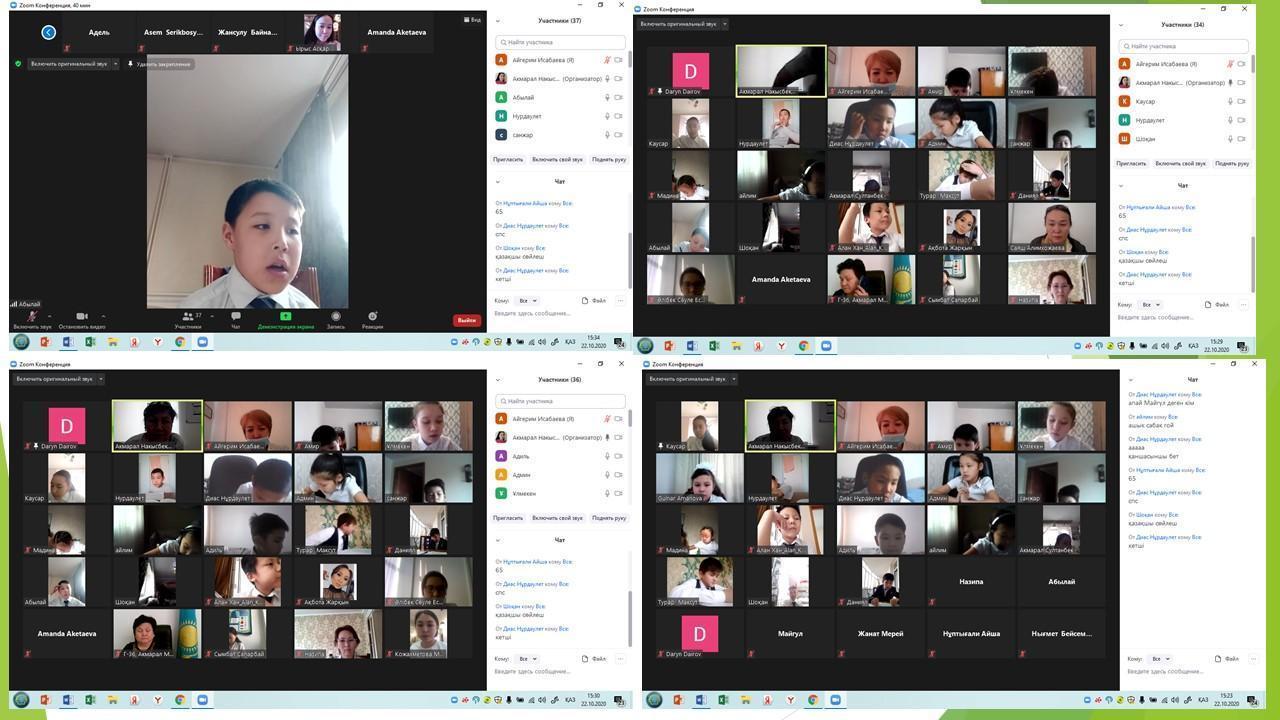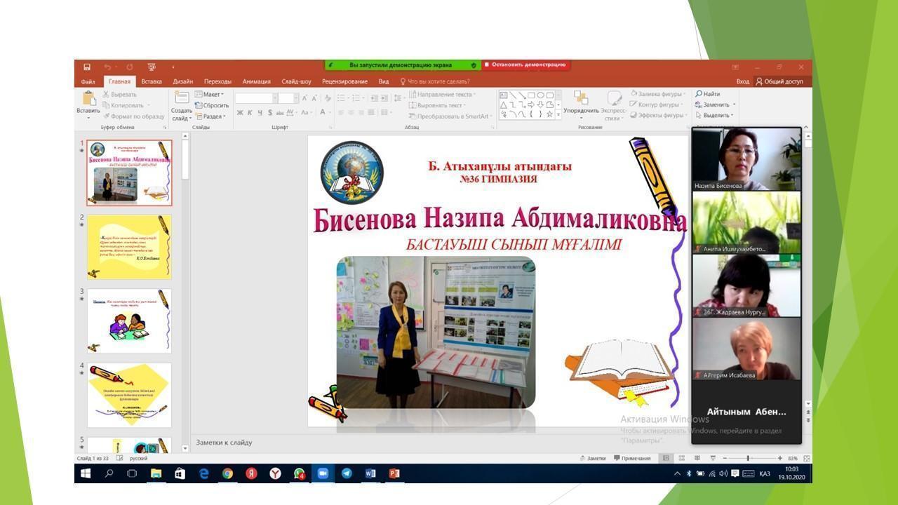 16.10.2020 күні А.Исабаева «Жай бөлшек. Жай бөлшекті оқу, жазу» тақырыбында ашық сабақ өтті. Сабақта zoom-ның барлық мүмкіндіктері қолданылды. Жаңа сабақты мұғалім сызбалар мен слайдтар арқылы түсіндіріп  және графикалық планшетті ұтымды колданды. Оқушылар белсенділік танытты.