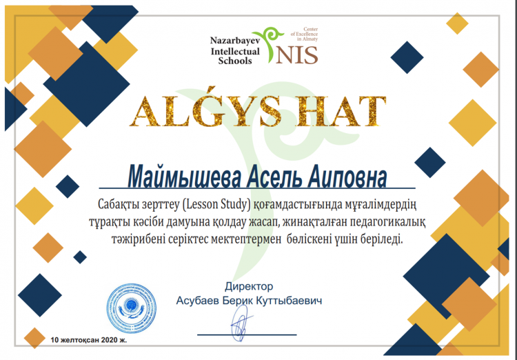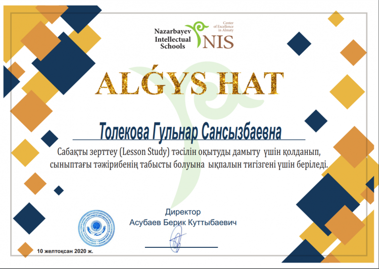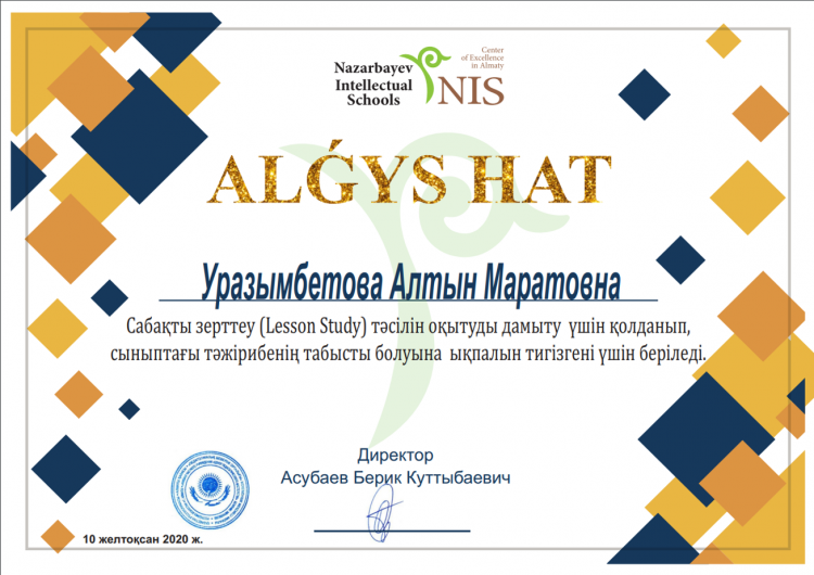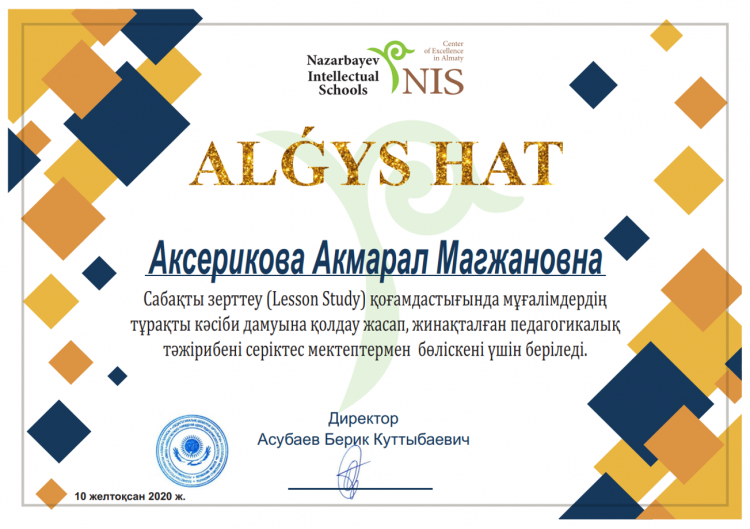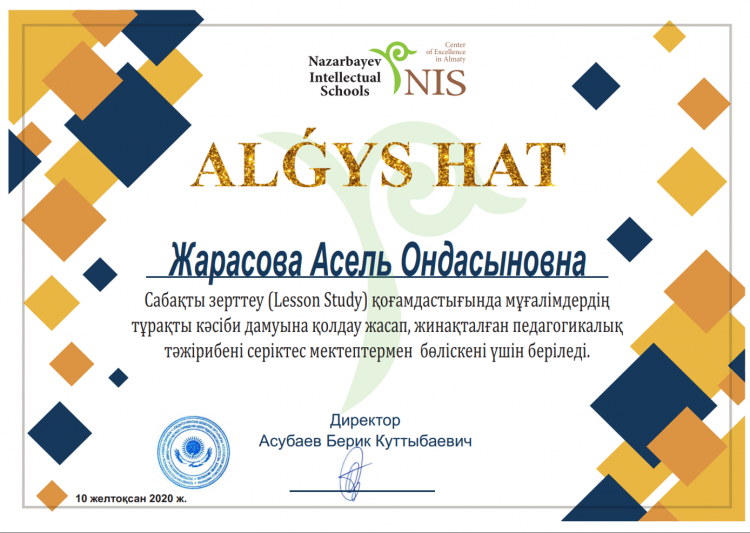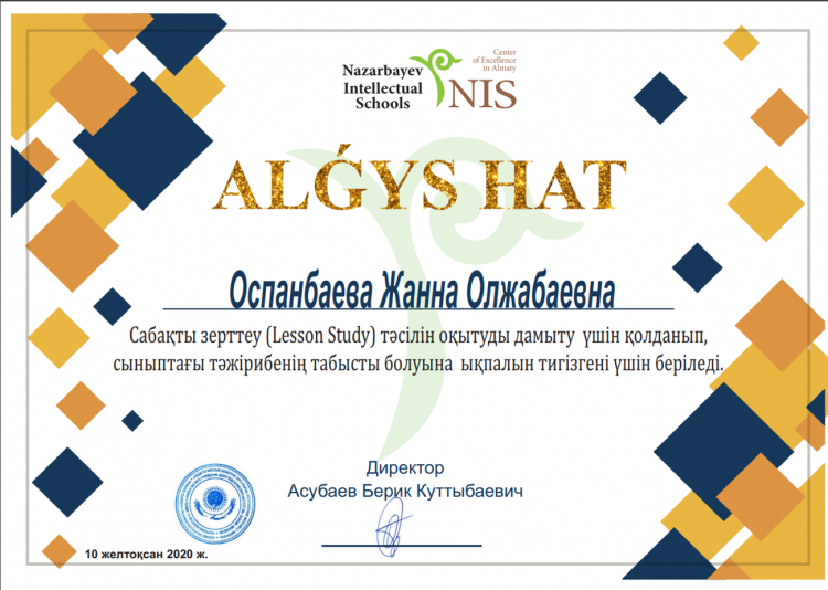 Алматы қаласы Білім басқармасының бұйрығымен құрылған жетекші мектептер арасында Алматы қаласы "Назарбаев Зияткерлік мектебі" ДББҰ Педагогикалық шеберлік орталығының басшысы Асубаев Берік Құттыбаевичтің басшылығымен және тренер Ғалия Нұрмановнаның ұйымдастыруымен ZOOM платформасында жиын өтті. Жиында осы уақытқа дейінгі жетекші мектептердің білім беру процесінде тиімді қолданылған өз идеяларымен бөлісіп, біршама атқарылған жұмыстары қорытындыланды. Сонымен қатар, №36 гимназияның басшысы Ақсерікова Ақмарал Мағжанқызы, гимназия мұғалімдері Толекова Г.С., Оспанбаева Ж.О., Уразымбетова А.М., Нақысбек Г.Н., Жарасова А.О., Маймышева А.А. Сабақты зерттеу тәсілін (Lesson Study) оқытуды дамыту үшін қолданып, сыныптағы тәжірибенің табысты болуына ықпалын тигізгені үшін марапатталды.