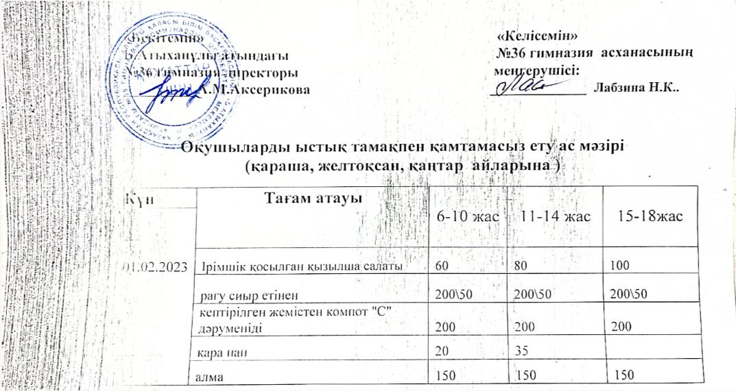 Төрт апталық бекітілген ас мәзірі (қыс-көктем) 1-4 сынып және СУСН