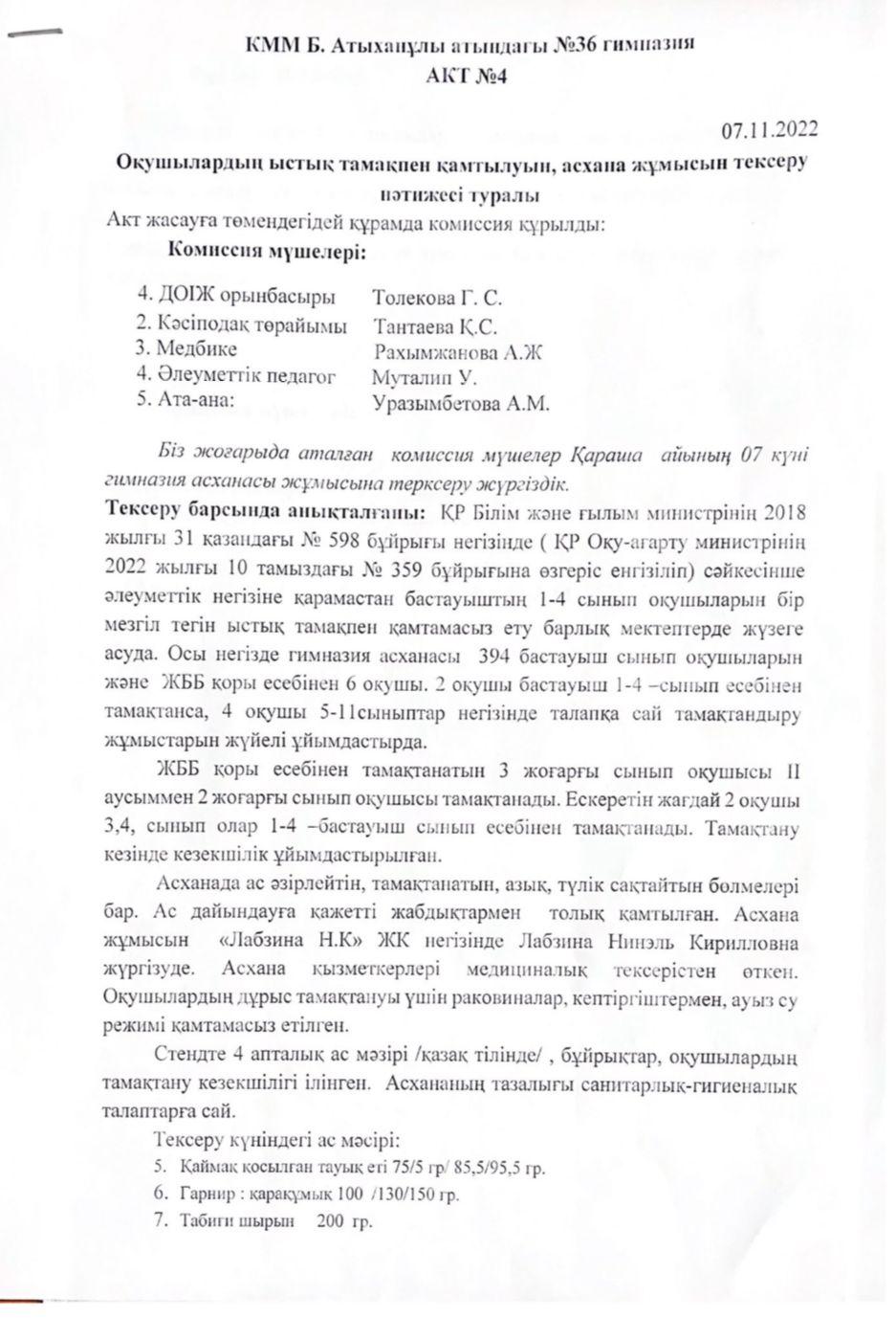 АКТ. Оқушылардың ыстық тамақпен қамтылуын, асхана жұмысын тексеру нәтижесі туралы