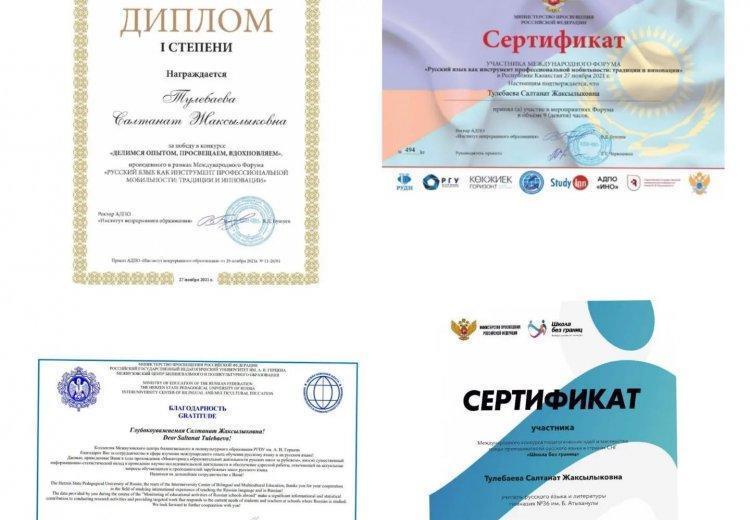 Б.Атыханұлы атындағы №36 гимназияның орыс тілі мен орыс әдебиеті пәнінің мұғалімі Тулебаева С.Ж. форум жұмысына белсене қатысып, "Делимся опытом , просвещаем и вдохновляем" секциясында 1-дәрежелі дипломмен және қатысқаны үшін сертификатпен және, "Школа без границ" атты ТМД елдеріндегі орыс тілі мұғалімдері арасындағы халықаралық педагогикалық идеялар мен дағдылар байқауының жеңімпазы атанып сонымен қатар, А.И.Герцен атындағы РГПУ қос тілді және көпмәдениетті білім беру университетаралық орталығының ұжымы орыс тілінде орыс тілін оқытудың халықаралық тәжірибесін зерттеу саласында бірлесіп жұмыс істегеніне №36 гимназияның орыс тілі мен әдебиеті пәнінің мұғалімі С.Ж. Тулебаеваға Алғыс білдіреді!
