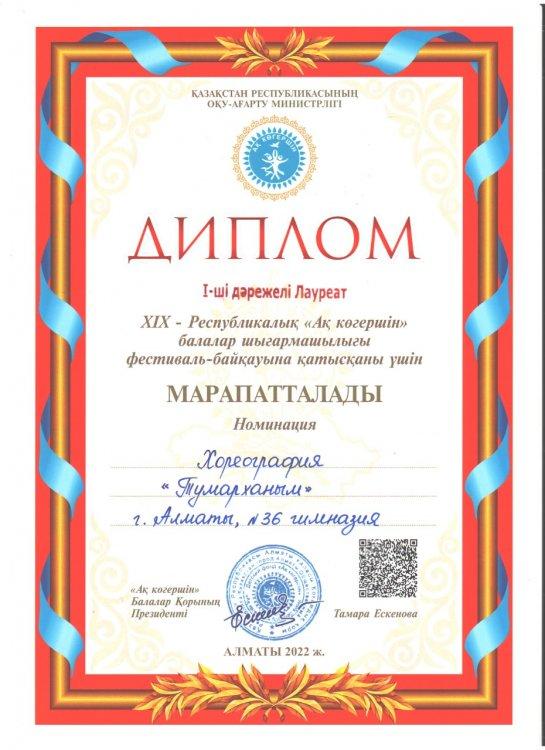 Тұңғыш Президент қорының ғимаратында XIX "Ақ көгершін" балалар шығармашылығы фестиваль- байқауы өтті.Байқауға еліміздің көптеген қалаларынан би ұжымдары келіп қатысты. Кіші топ (7-10жасар аралығы) бойынша Б. Атыханұлы атындағы 36 гимназия "Тұмарханым"халықтық билер студиясы Бас жүлде және 1 орын иегерлері атанды.