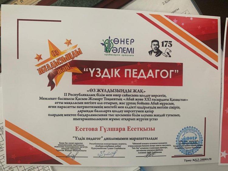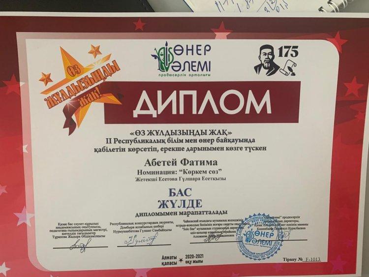 "ӨЗ ЖҰЛДЫЗЫҢДЫ ЖАҚ" ІІ Республикалық білім мен өнер байқауында қабілетін көрсетіп, ерекше дарынымен көзге түскен гимназиямыздың 9 сынып оқушысы АБЕТЕЙ ФАТИМА "Көркем сөз" номинациясы бойынша БАС ЖҮЛДЕ дипломымен марапатталды. Жетекшісі ЕСЕТОВА ГҮЛШАРА ЕСЕТҚЫЗЫ "ӨЗ ЖҰЛДЫЗЫҢДЫ ЖАҚ" ІІ Республикалық білім мен өнер сайысына қолдау көрсетіп, Мемлекет басшысы Қасым-Жомарт Тоқаевтың "Абай және ХХІ ғасырдағы Қазақстан " атты мақаласын негізге ала отырып, жас ұрпақ бойына Абай мұрасын,яғни парасатты патриотизмнің мектебі мен елдікті қадірлеудің негізін сіңіріп, дарынды балаларға қолдау көрсетумен қатар олардың мектеп бағдарламасынан тыс қосымша білім алуына жағдай туғызып, шығармашылықпен жұмыс атқарып жүргені үшін "ҮЗДІК ПЕДАГОГ" дипломымен марапатталды.
